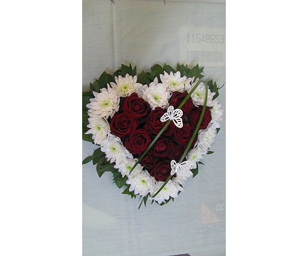 Двадесет и три бели и червени рози аранжирани в кутия сърце.