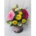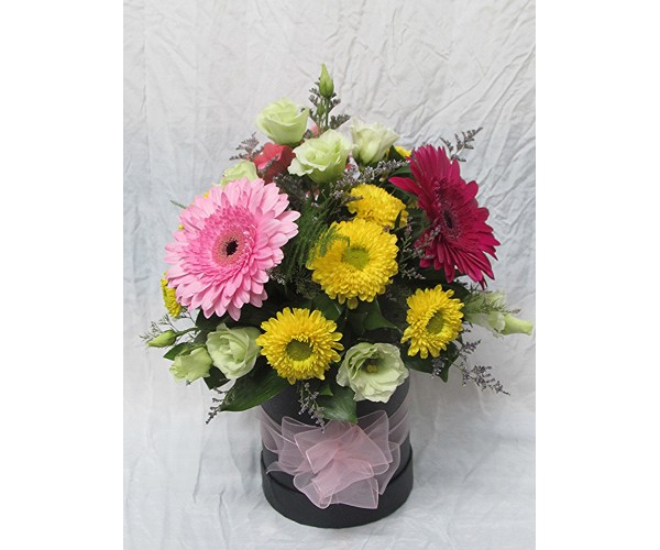 Настроение Пъстроцветни гербери аранжирани в черна кутия с хризантема и еустома.
