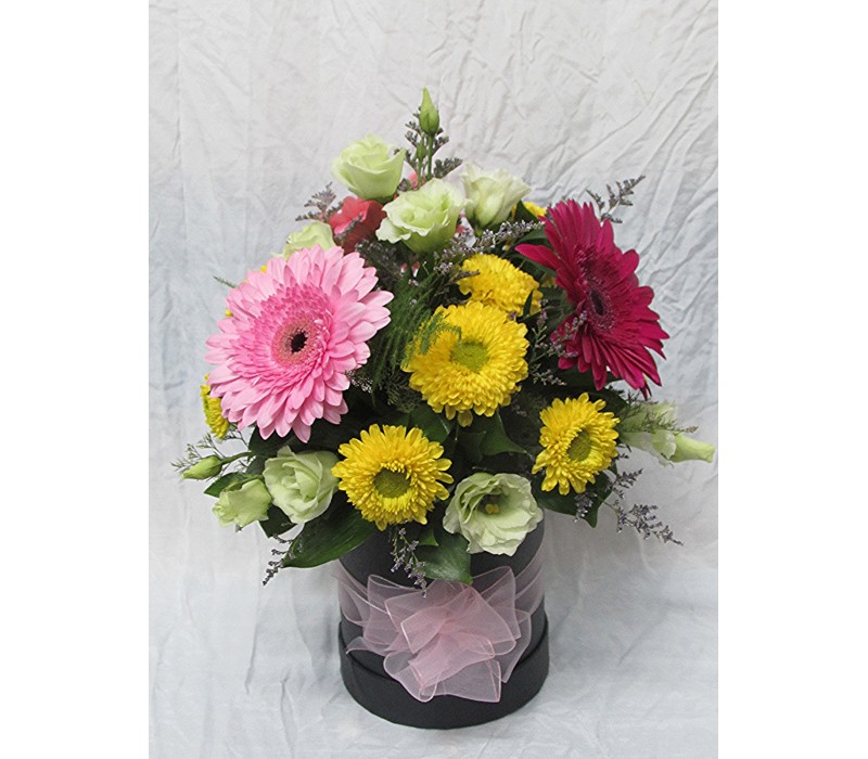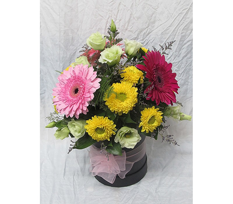 Пъстроцветни гербери аранжирани в черна кутия с хризантема и еустома.