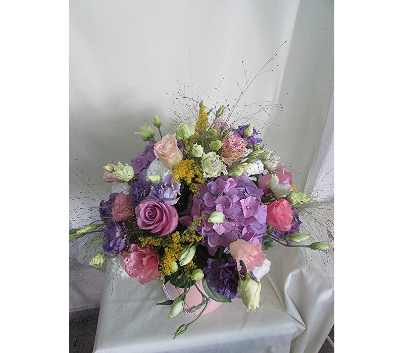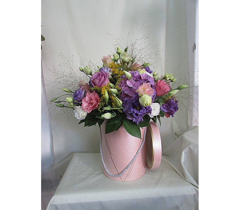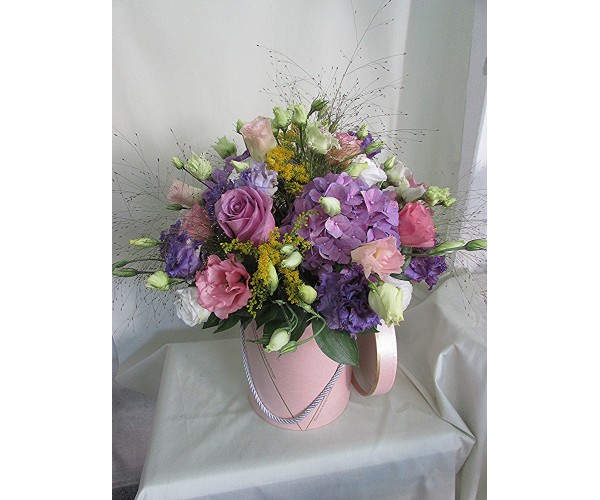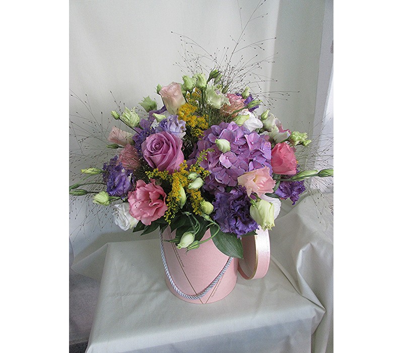 Усещане за лилаво. Микс от рози, хортензия и еустома ,аранжирани в стилна нежно розова кутия. соната