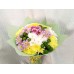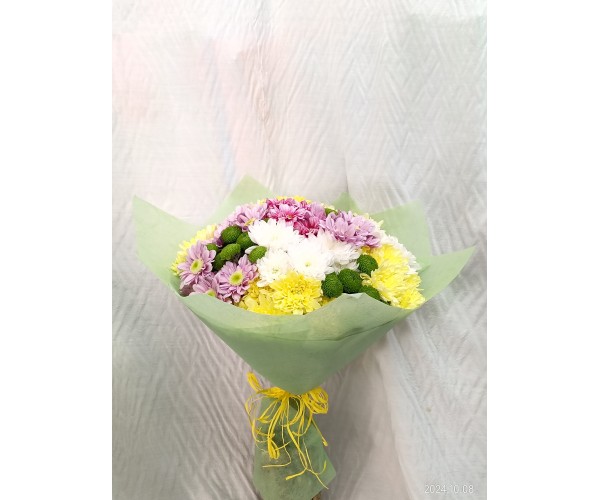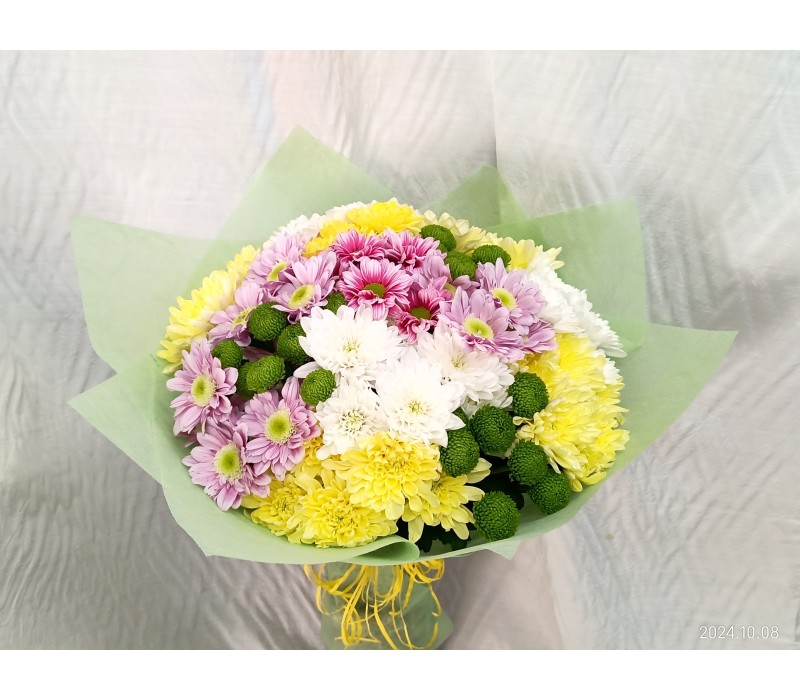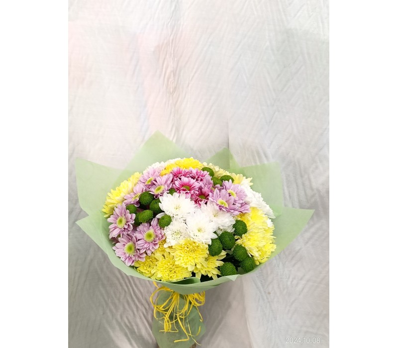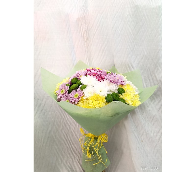 Букет 15 броя пъстроцветни хризантеми , нежно обгърнати от текстилна опаковка.