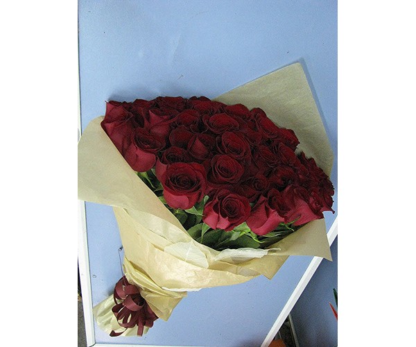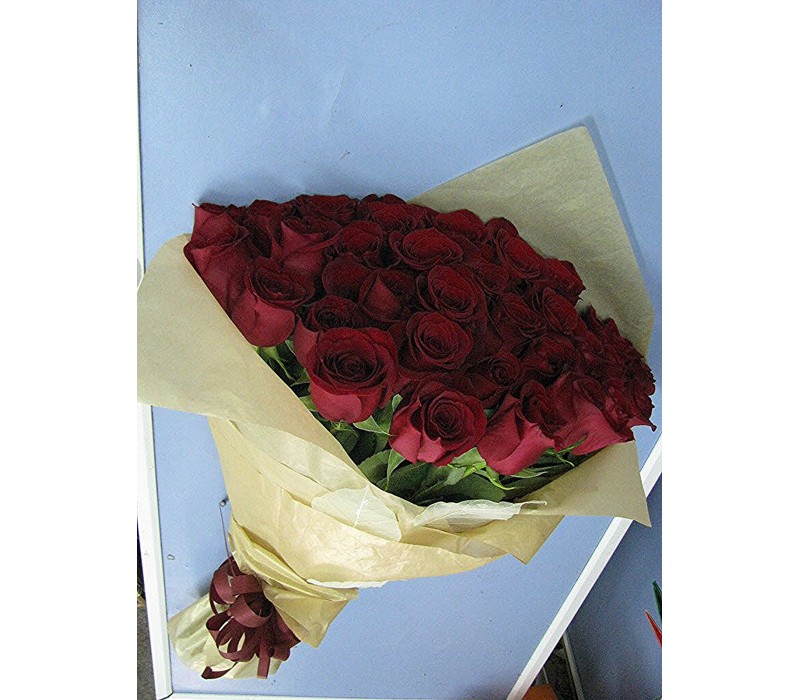 Букет с 15 бр. разноцветни рози в опаковка, аранжирани с гипсофил и берграс