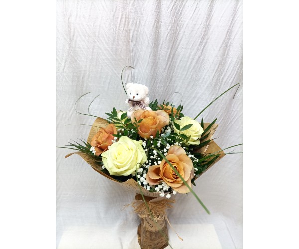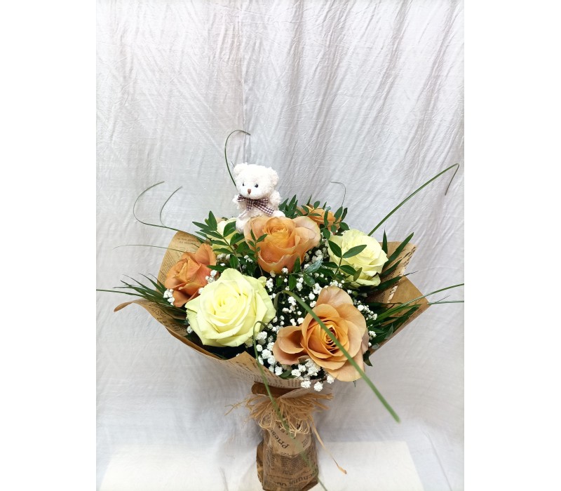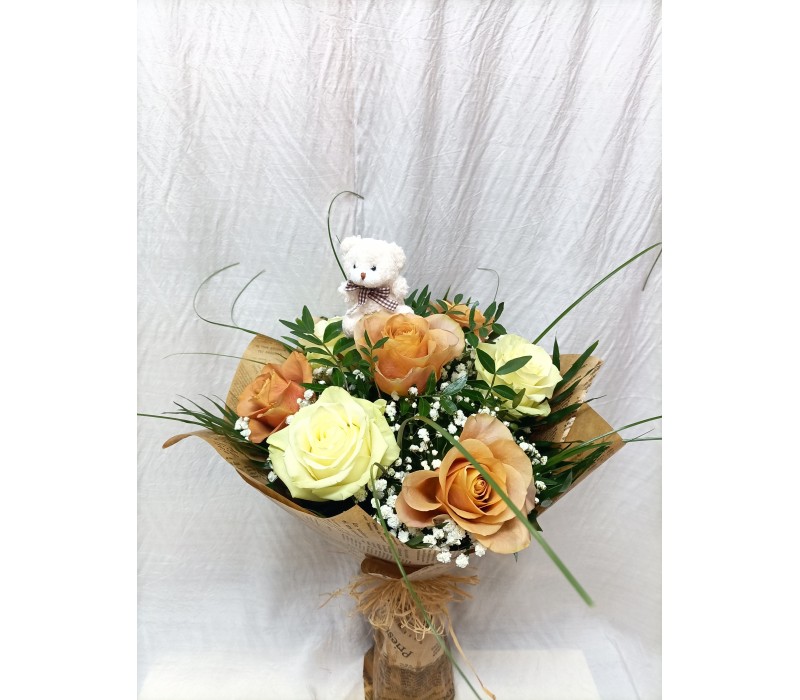 Букет 7 бр рози с гипсофил и зеленина обвити с крафт хартия.