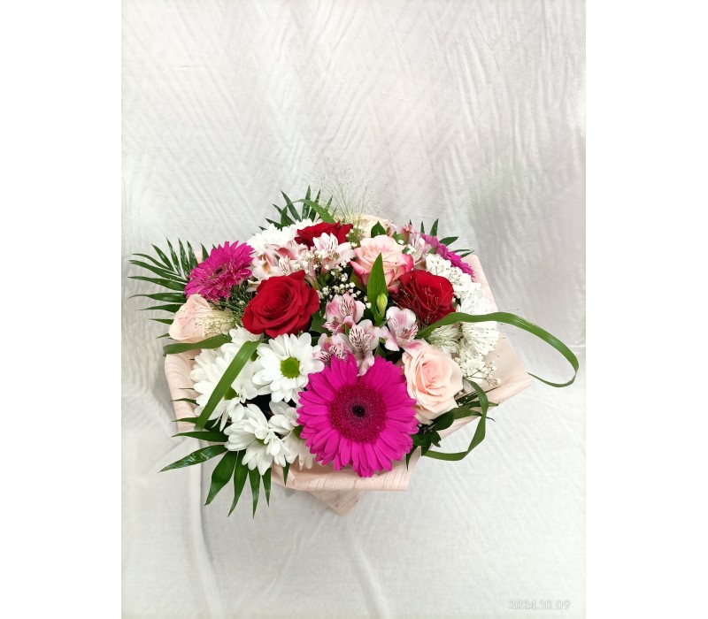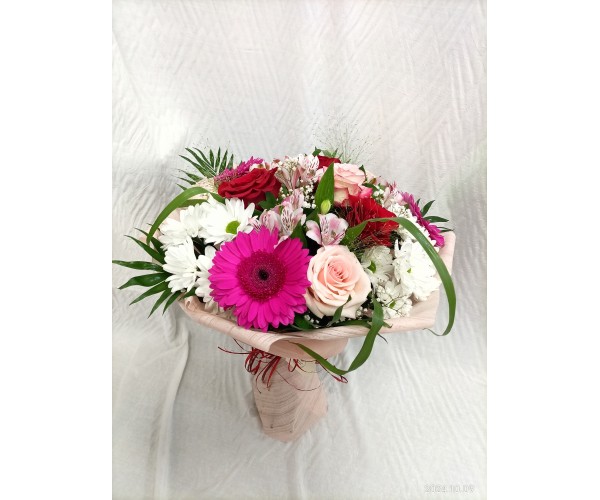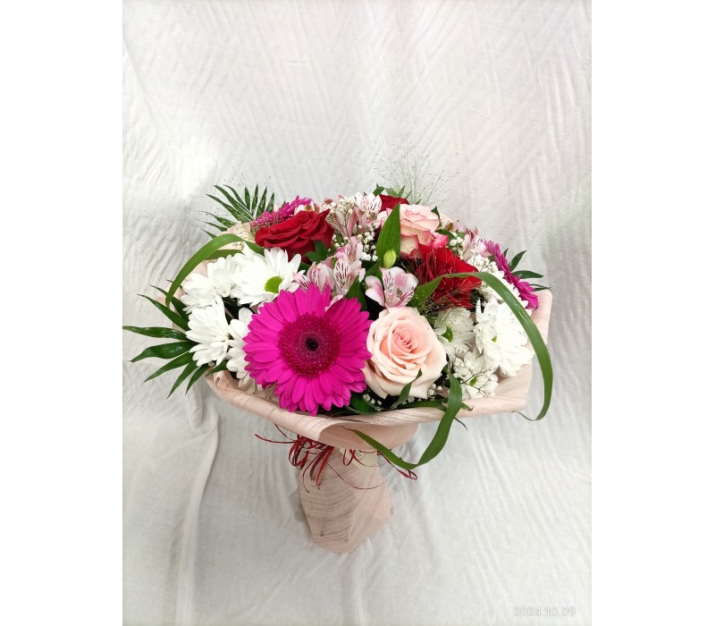 Букет микс от рози, алстромерия, хризантема и гербер. 15 стръка