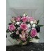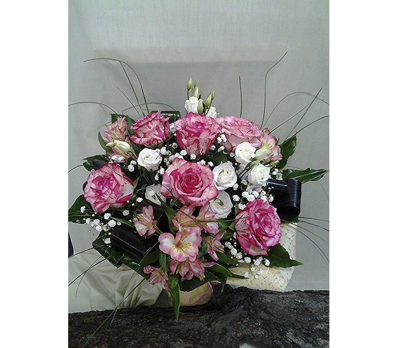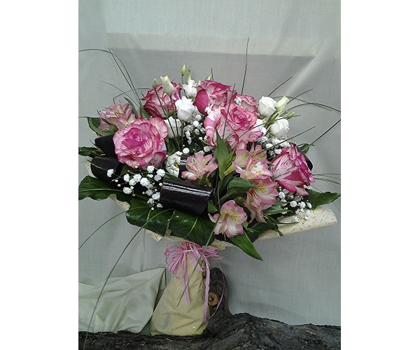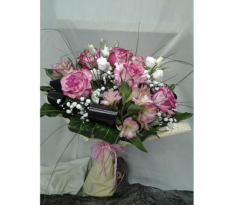 Нежен букет с рози, алстромерия и еустома аранжиран с листа аралия