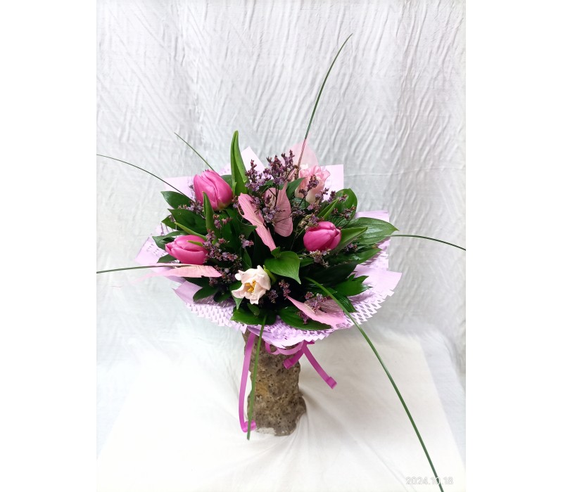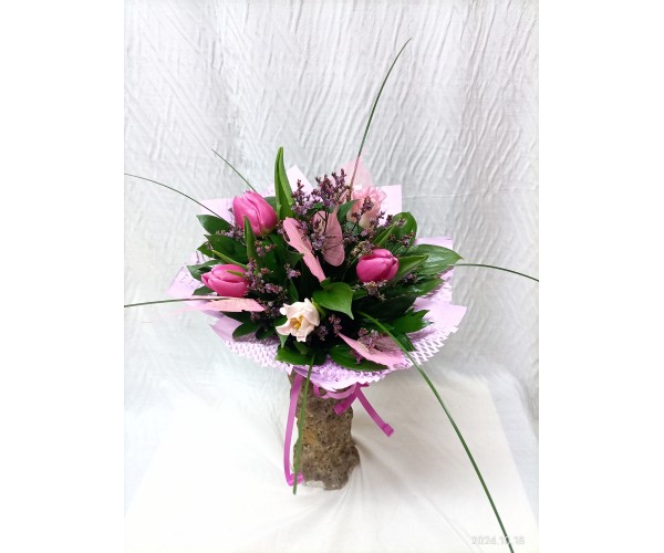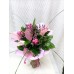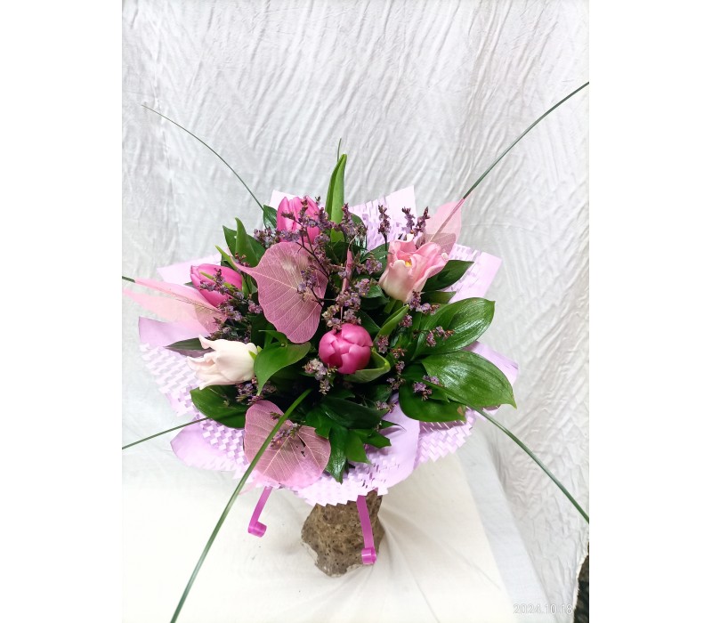 Букет комбинация от рози и спрей рози нежно обгърнати с мрежа.