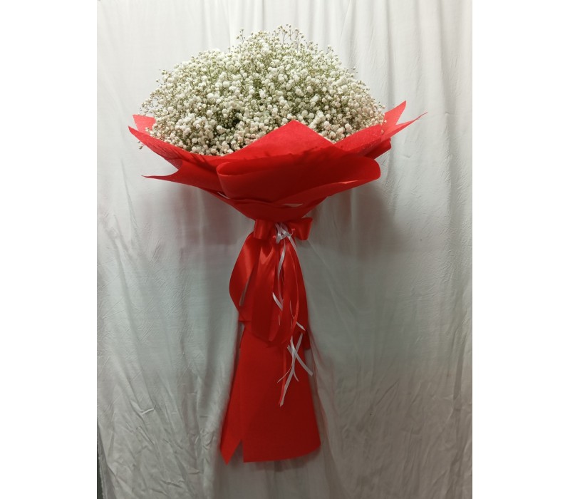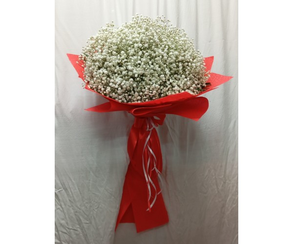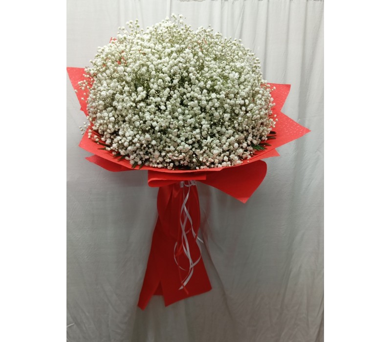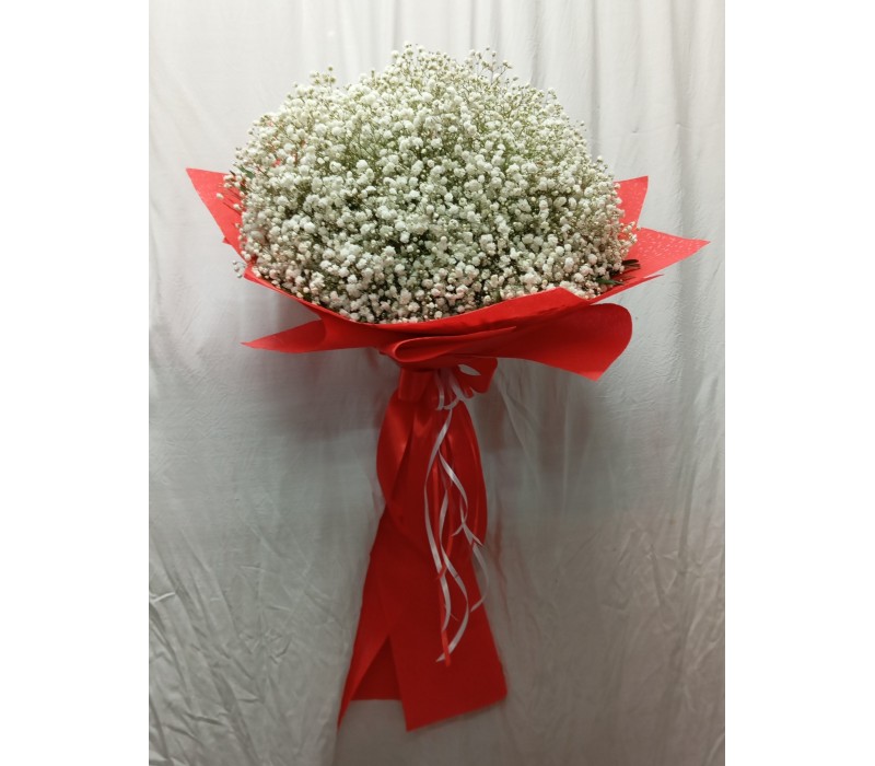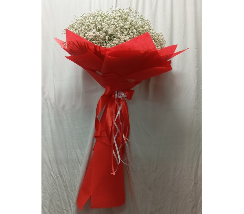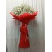 Букет с 15 бр. разноцветни рози в опаковка, аранжирани с гипсофил и берграс