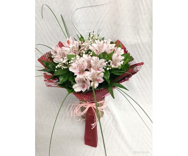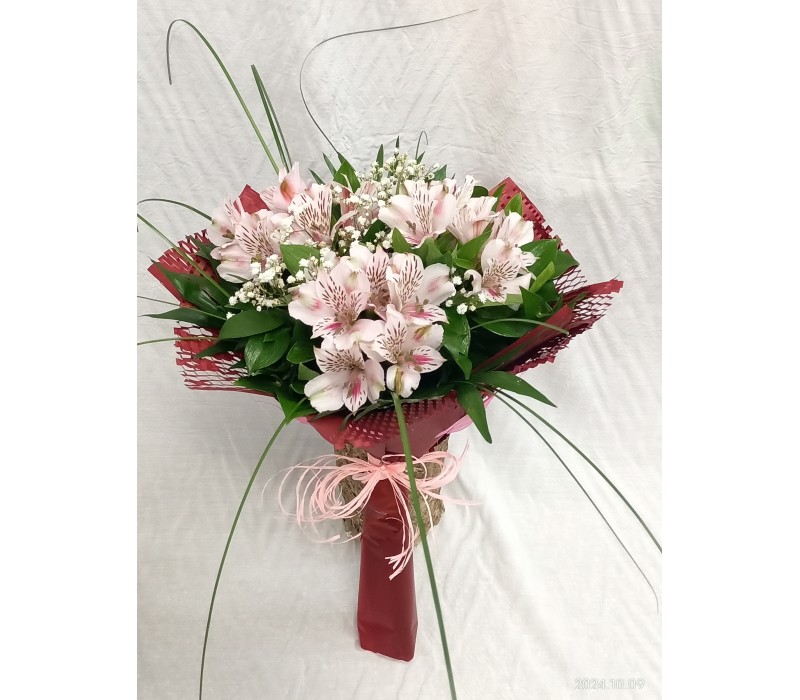 Букет от гипсофил в стилна червена опаковка.Стилен букет с три броя алстромерия.