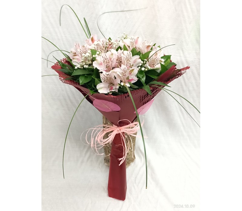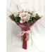 Нежен букет с рози, алстромерия и еустома аранжиран с листа аралия