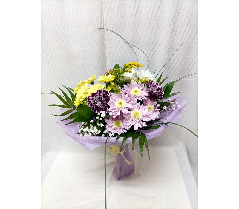 Букет от пъстроцветни хризантеми в комбинация с карамфил.