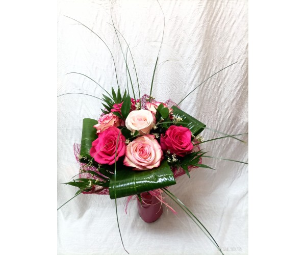 Букет комбинация от рози и спрей рози нежно обгърнати с мрежа.