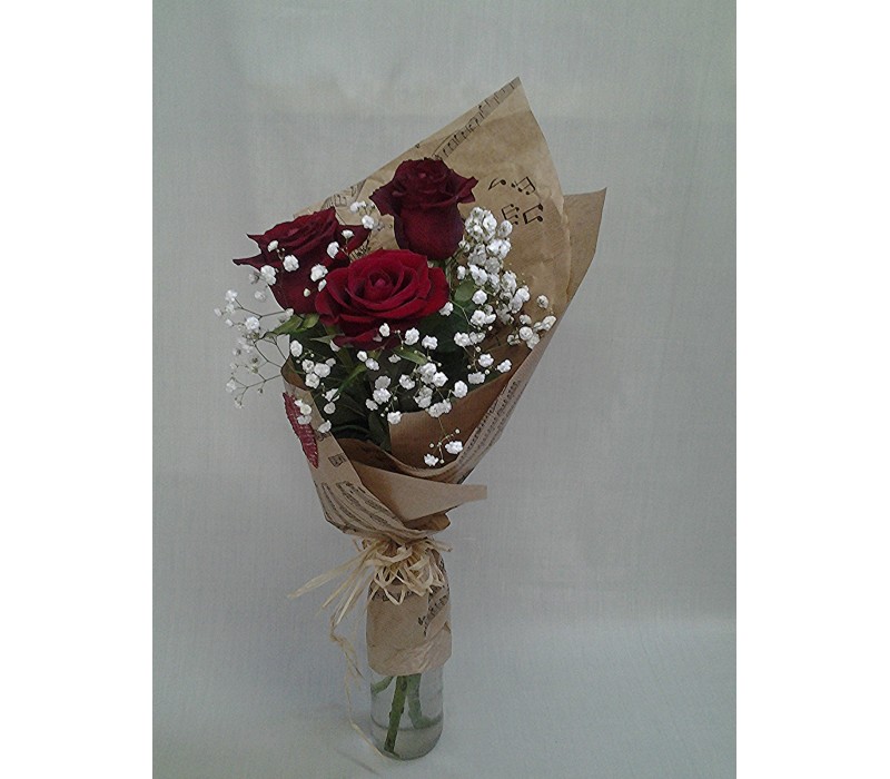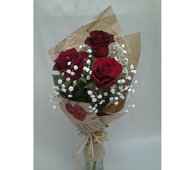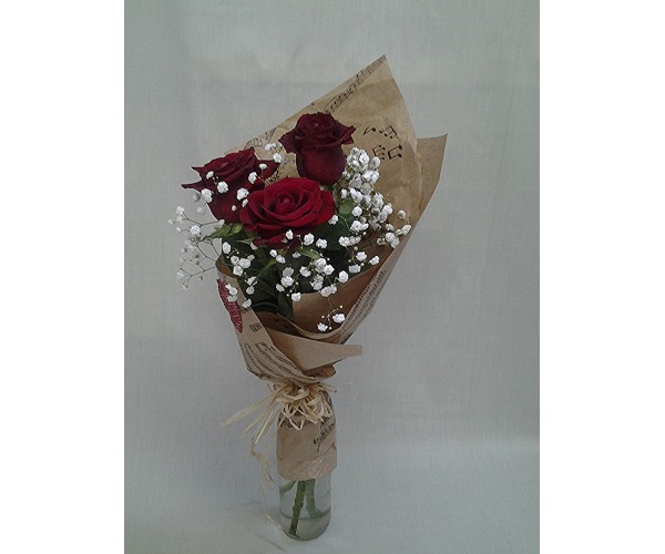 Букет с три рози обгърнати с гипсофил и крафт хартия