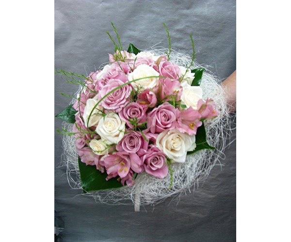Букет комбинация от рози и спрей рози нежно обгърнати с мрежа.