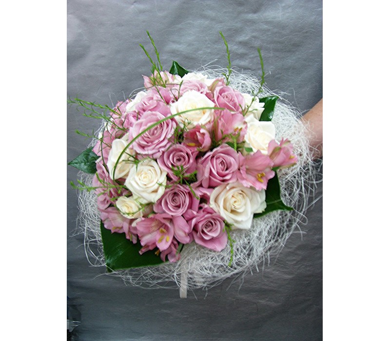 Букет с рози и алстромерия, аранжиран с нежна зеленина, в текстилна опаковка.