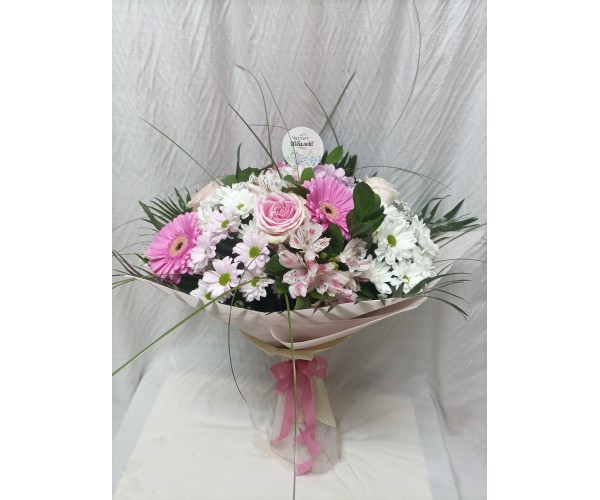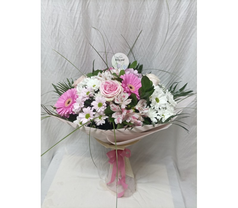 Букет в нежно розово от рози, гербер, хризантема и алстромерия – 13 стръка цветя