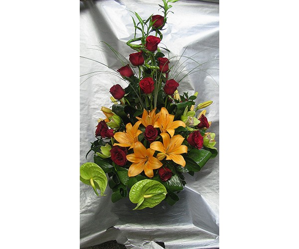 Рози, лилиум, алстромерия аранжирани в кутия.
