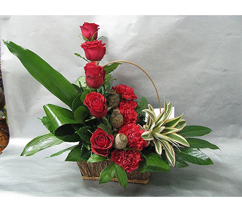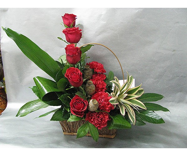 Кошница с 3 бр. лилиум, 9 бр. рози и 3 бр. гладиол.