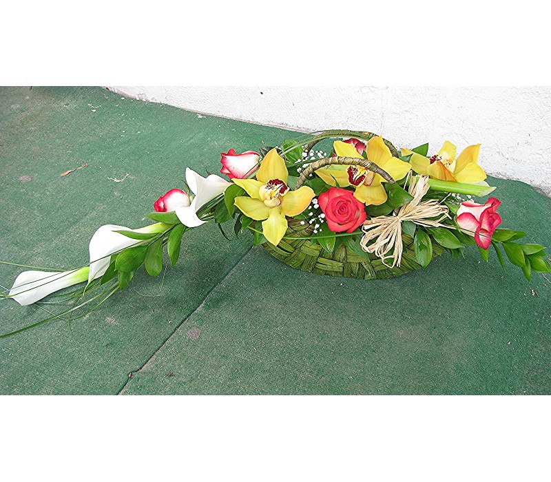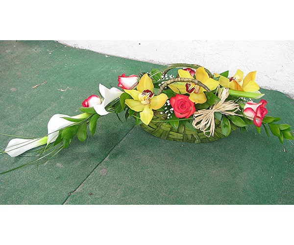 Кокетна кошничка с 5 бр. рози, 3 бр. кали и 5 бр. цимбидиум.