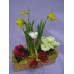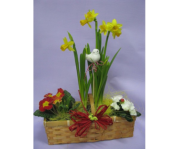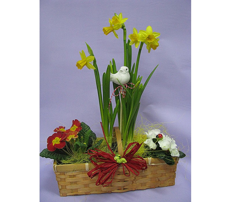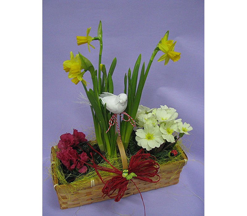 Композиция със пролетни саксийни цветя, Примула, Нарцис и Азалия в кошничка.