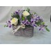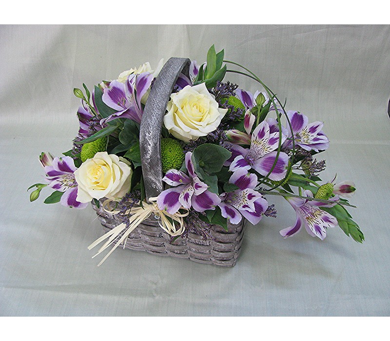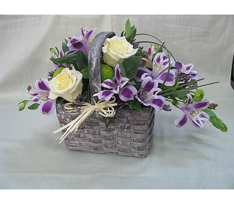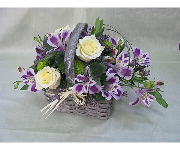 Кошничка с 3 бр. кремави рози, хризантема и 4 бр. лилава астромерия.