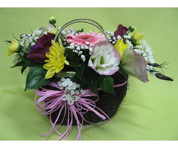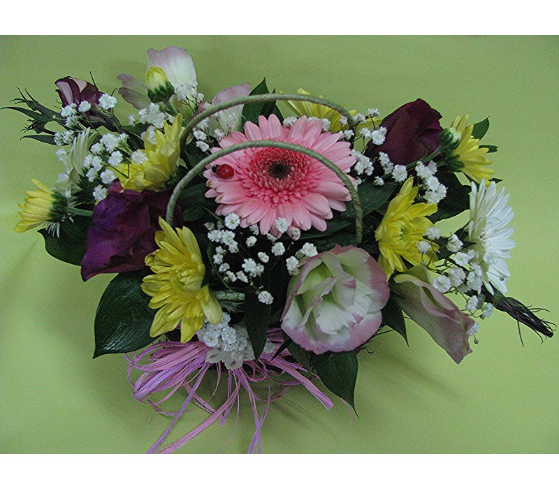 Кошничка с гербер, хризантема и еустома.