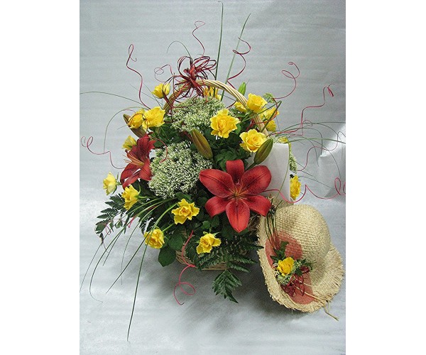 Кошница с 25 бр. жълти рози, лилиум бордо и бял трахелиум.