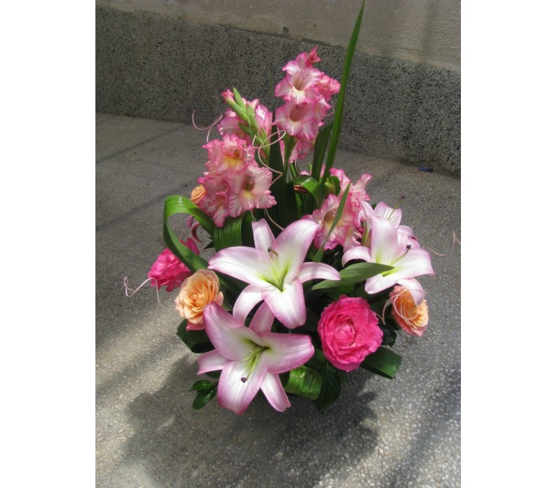 Кошница с 3 бр. лилиум, 9 бр. рози и 3 бр. гладиол.