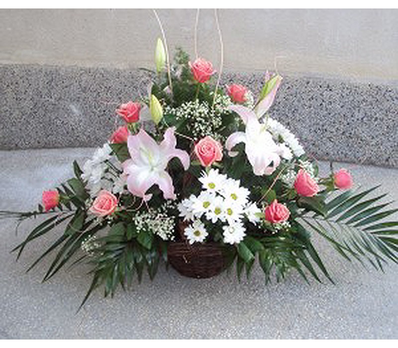Кошница с 3 бр. розов лилиум, 15 бр. розови рози и 5 бр. бяла хризантема.