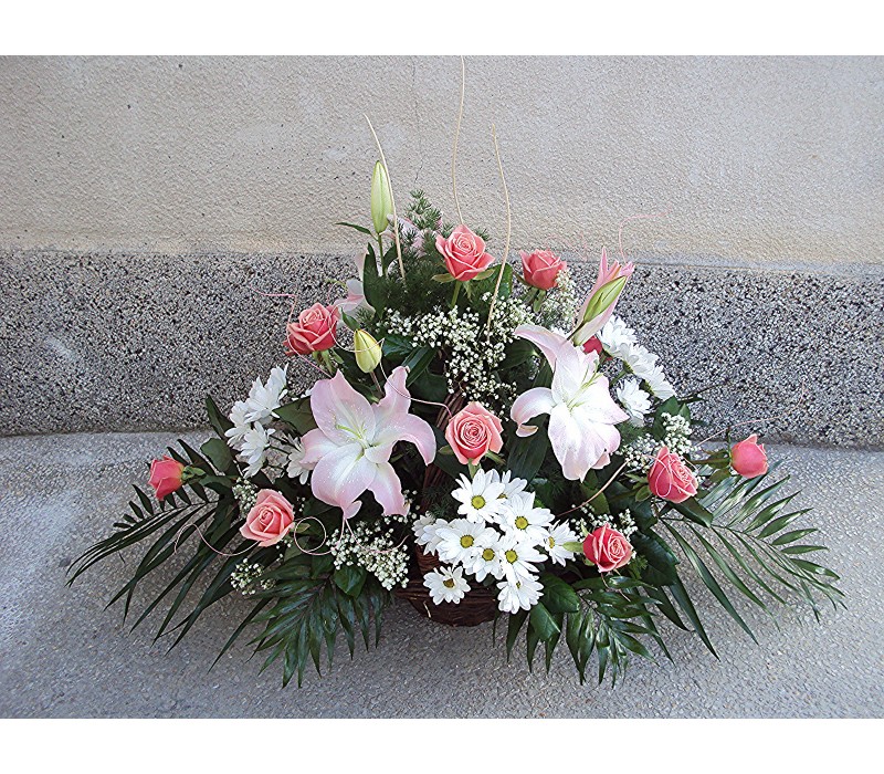 Кошница с 3 бр. розов лилиум, 5 бр. бял гладиол и 3 бр. бяла хризантема.
