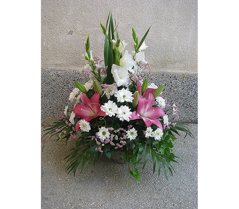 Кошница с 3 бр. розов лилиум, 5 бр. бял гладиол и 3 бр. бяла хризантема.