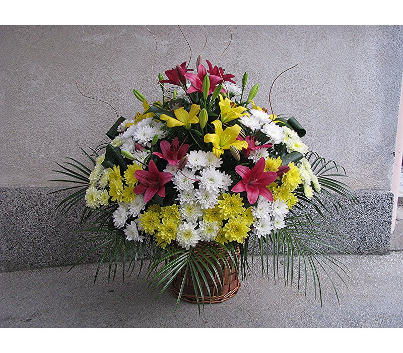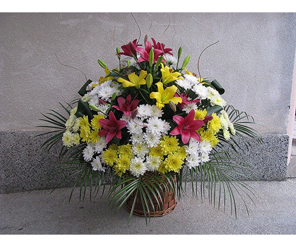 Кошница с 3 бр. лилиум, 9 бр. гербер, 6 бр. хризантема и 3 бр. гладиол.
