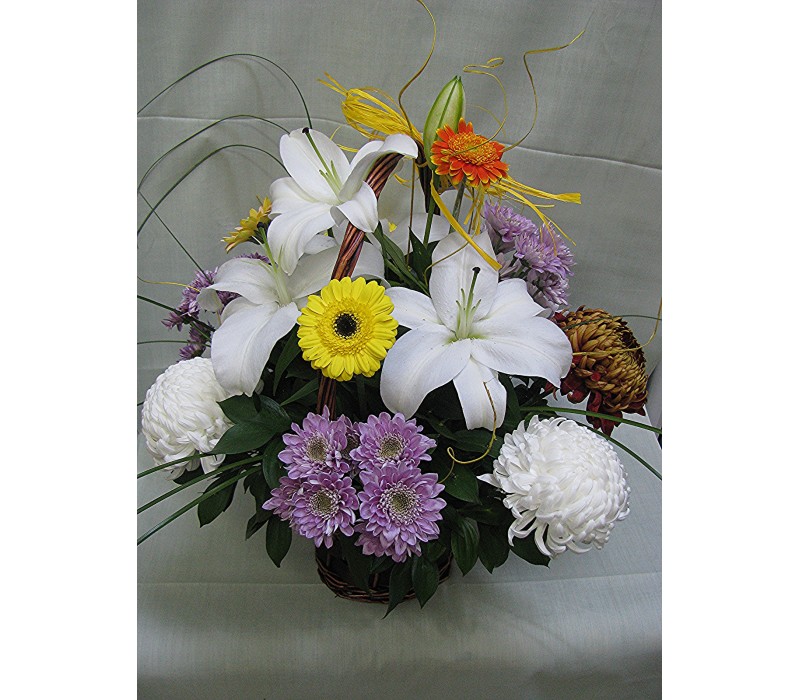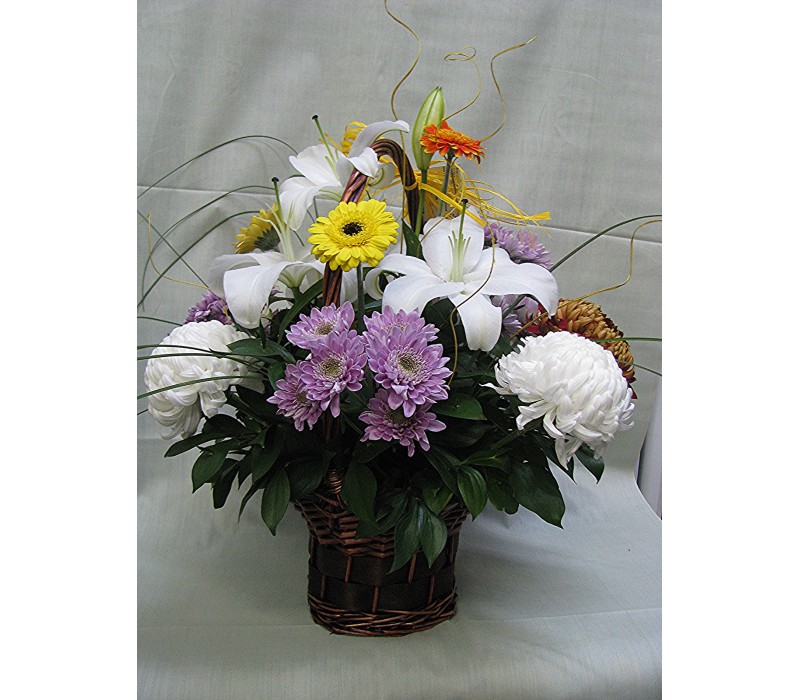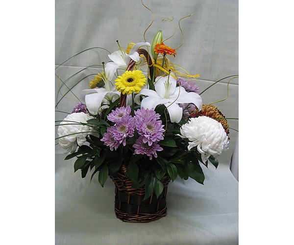 Кошница с 3 бр. лилиум, 9 бр. гербер, 6 бр. хризантема и 3 бр. гладиол.