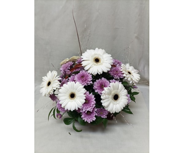 Кошничка с 3 бр. мини гербер и 3 бр. еустома.