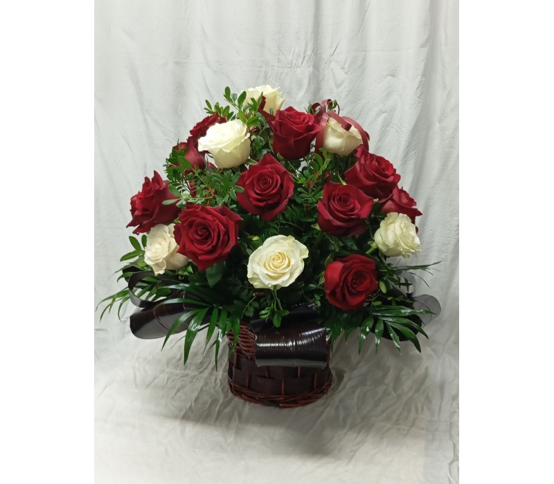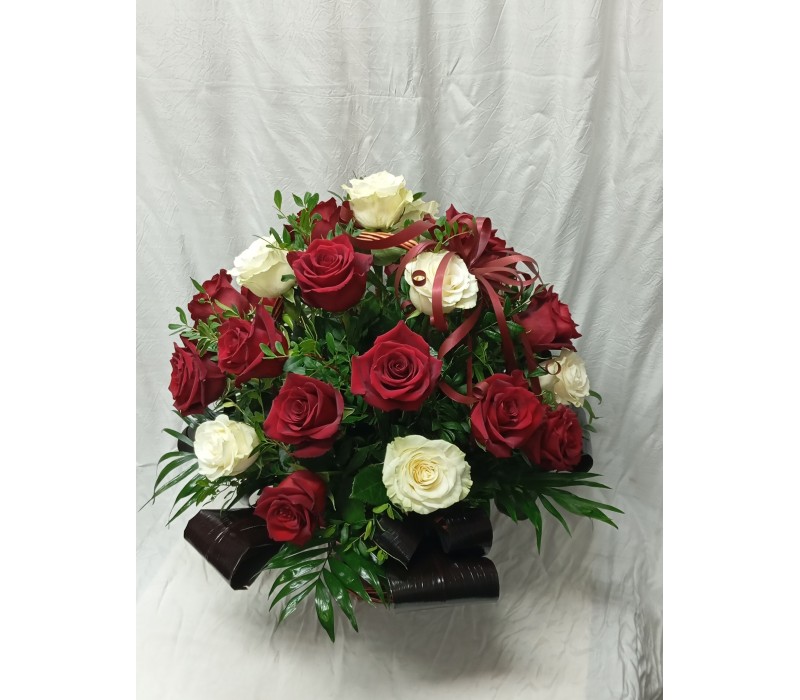 Кошница с 25 бр. жълти рози, лилиум бордо и бял трахелиум.