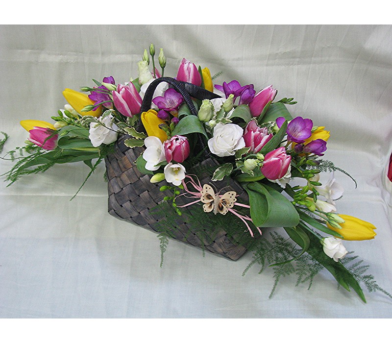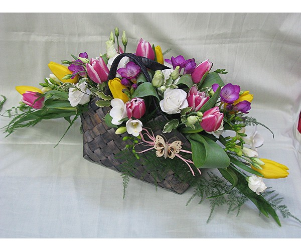Кошница с пъстроцветни лалета, фрезия и еустома 31 бр. стръкове