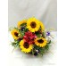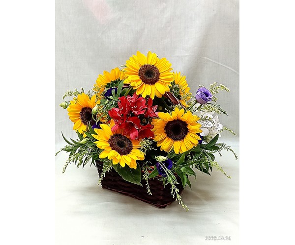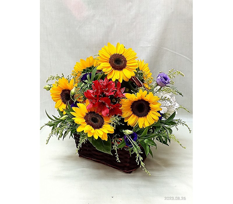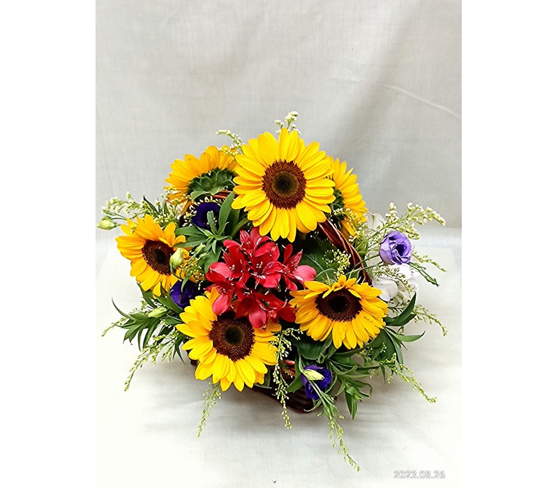 Кошница със слънчеви слънчогледи , алстромерия и еустома
