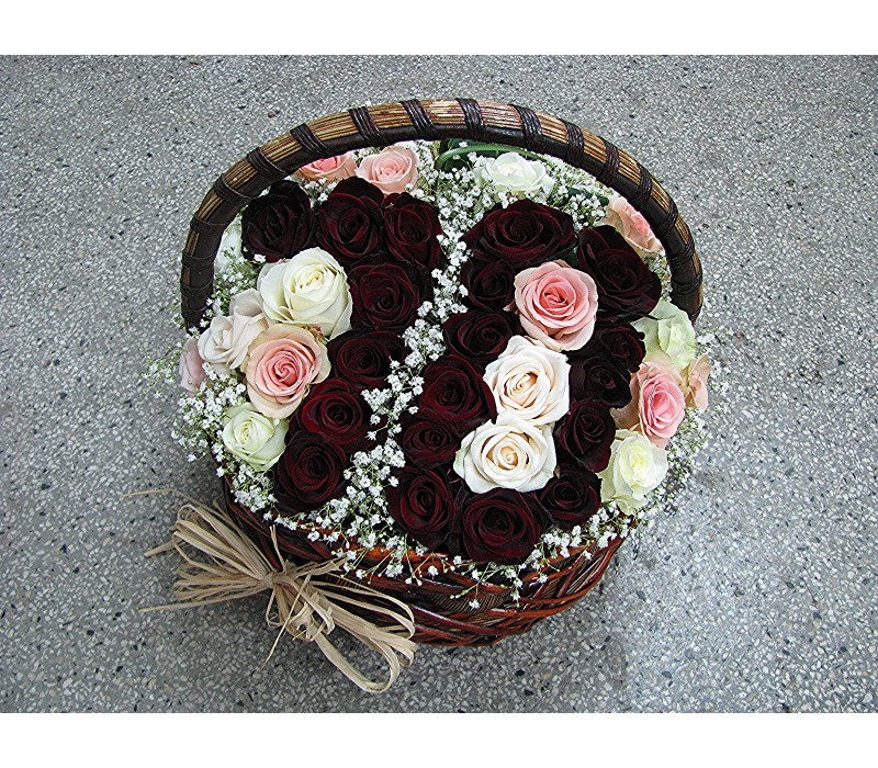 Кошница цифра 25 с 21 бр. червени рози и 12 бр. бели рози.