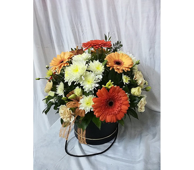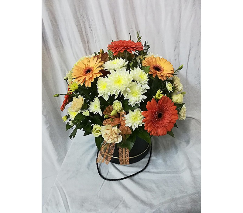 Кутия с гербери, хризантема и еустома в топли жълто оранжеви тонове.