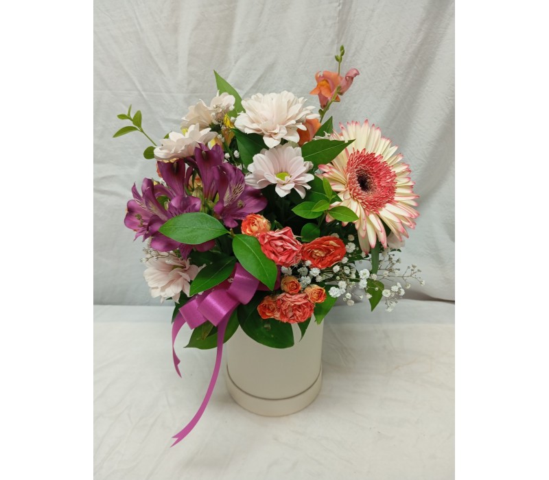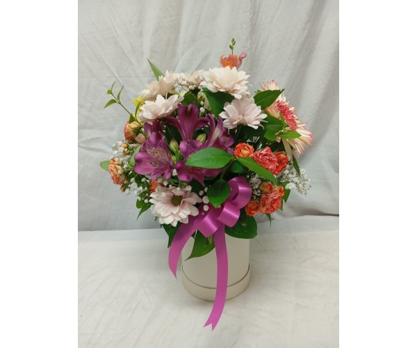 Бели рози и лилава алстромерия аранжирани в кутия.