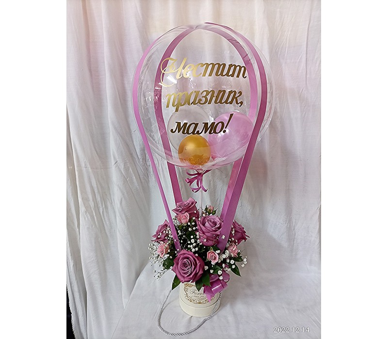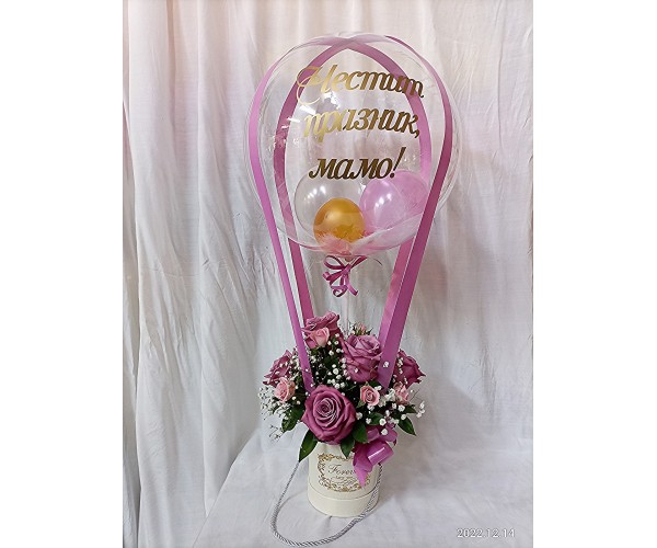 Бели рози и лилава алстромерия аранжирани в кутия.