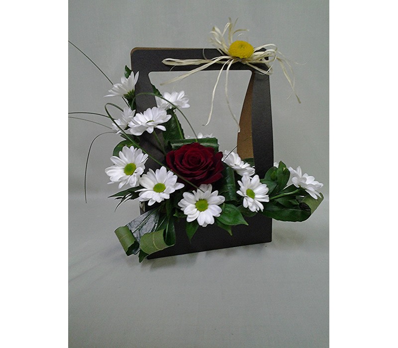 Прекрасна червена роза , аранжирана в чантичка , в комбинация на бяла хризантемка.