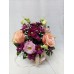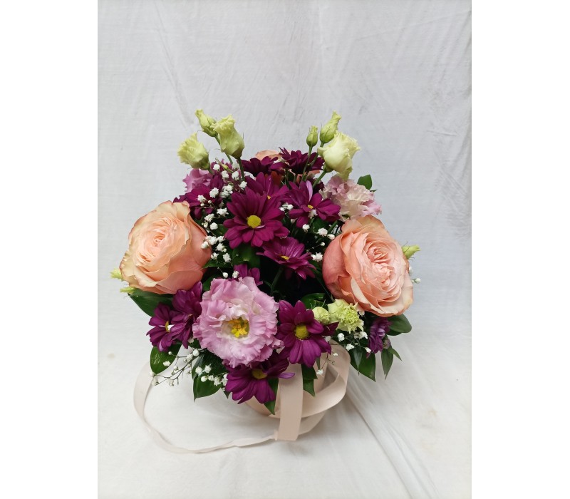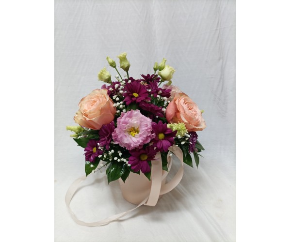 Рози цвят праскова в комбинация с еустома и хризантема, аранжирани в кутия.
