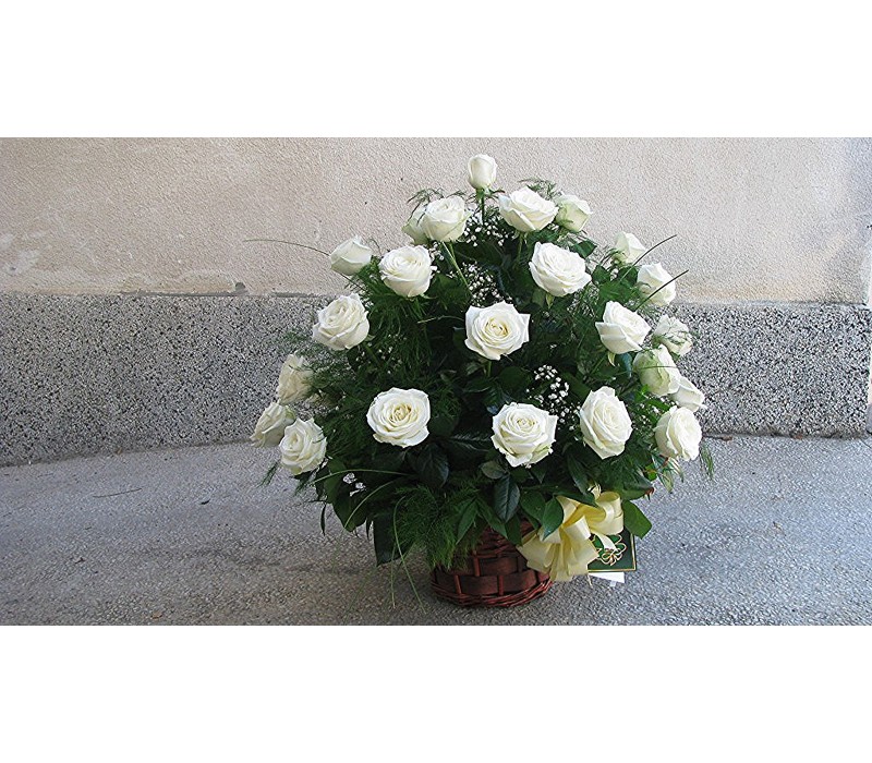 Букет от 7 бр бели рози ,декорирани с нежно розова еустома в кутия.