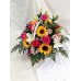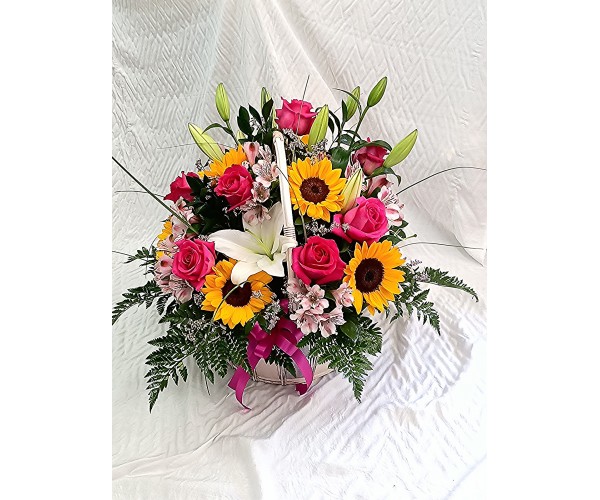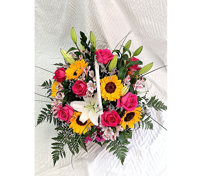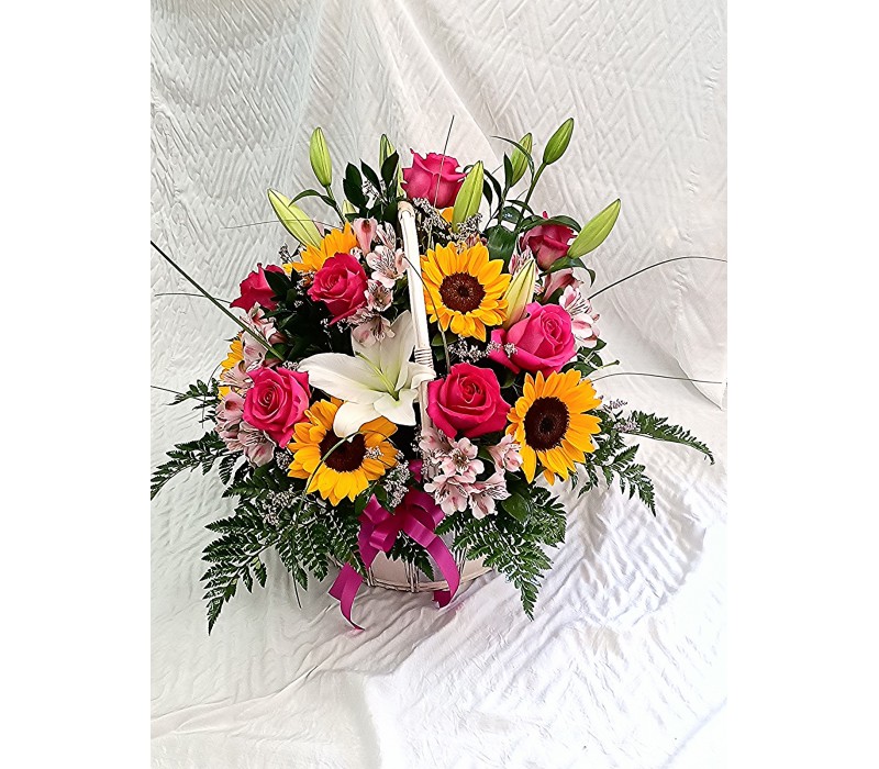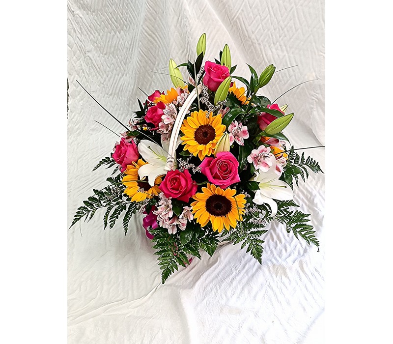 Кошница със слънчеви слънчогледи , алстромерия и еустома