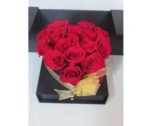 Кутия сърце аранжирана с червени рози и жълт цимбидиум.