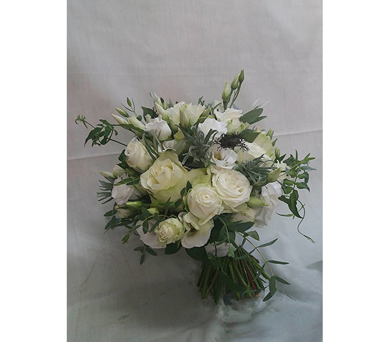 Нежен букет с бели рози, спрей рози, алстромерия и еустома аранжиран с нежна зеленина.