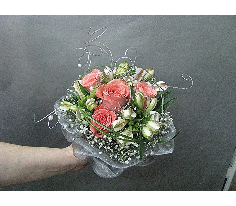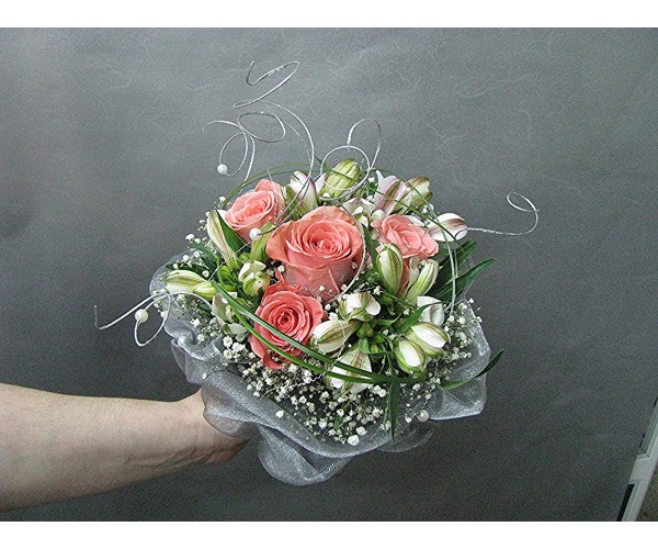 Нежен букет с рози и алстромерия аранжиран с зеленина и гипсофил.