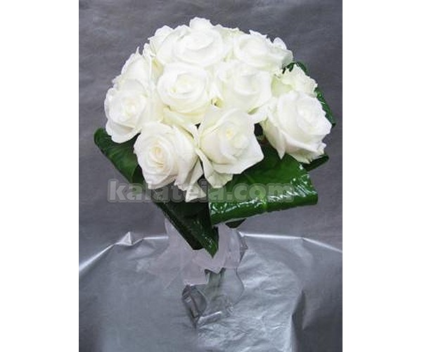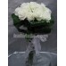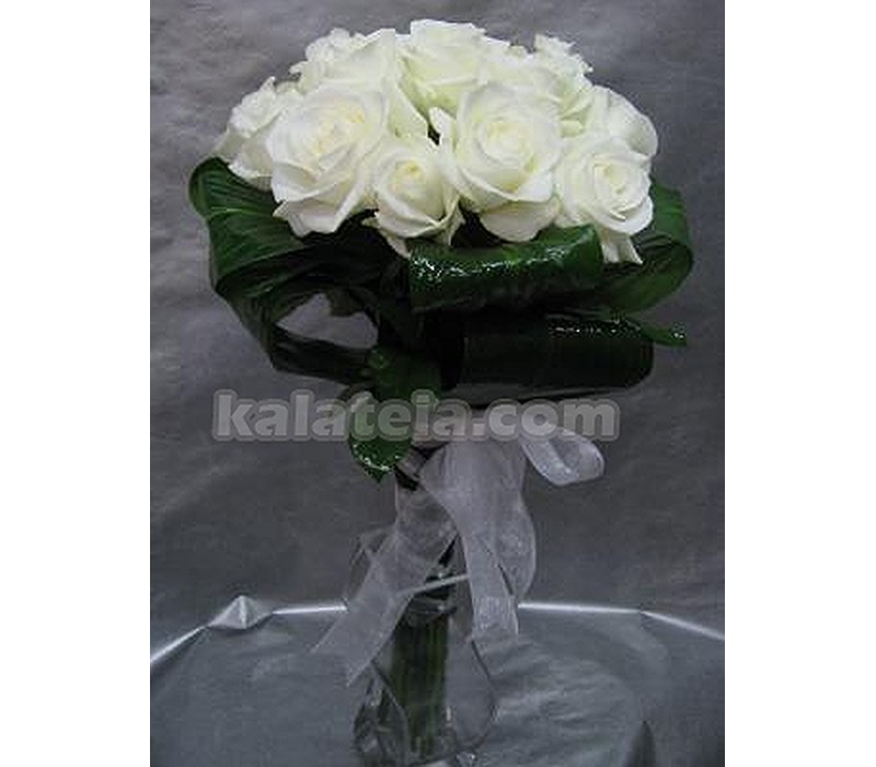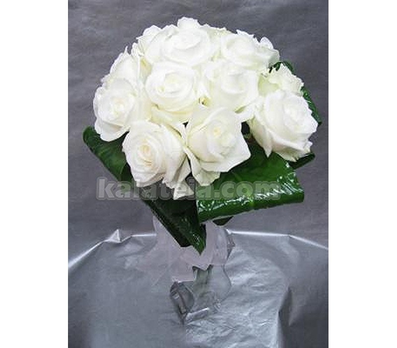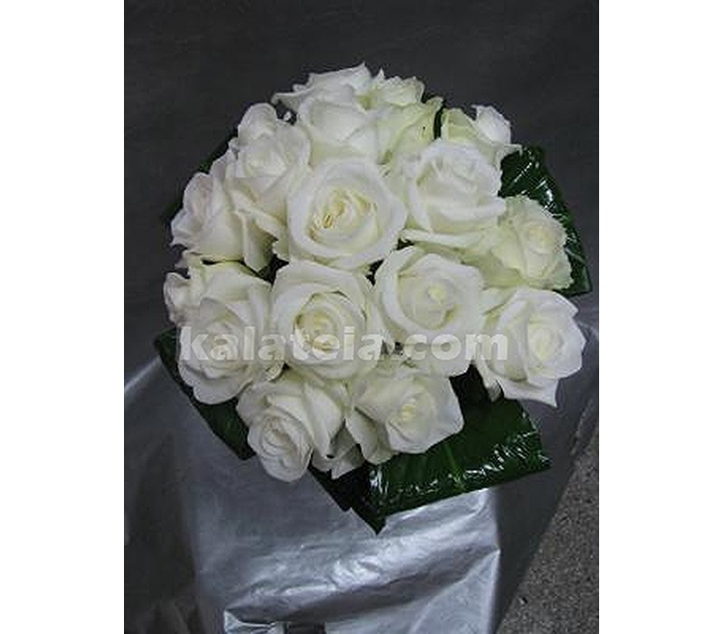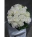 Букет от 7 бр бели рози ,декорирани с нежно розова еустома в кутия.