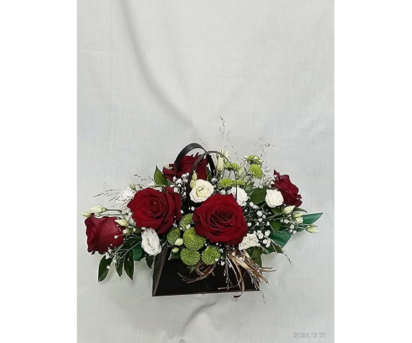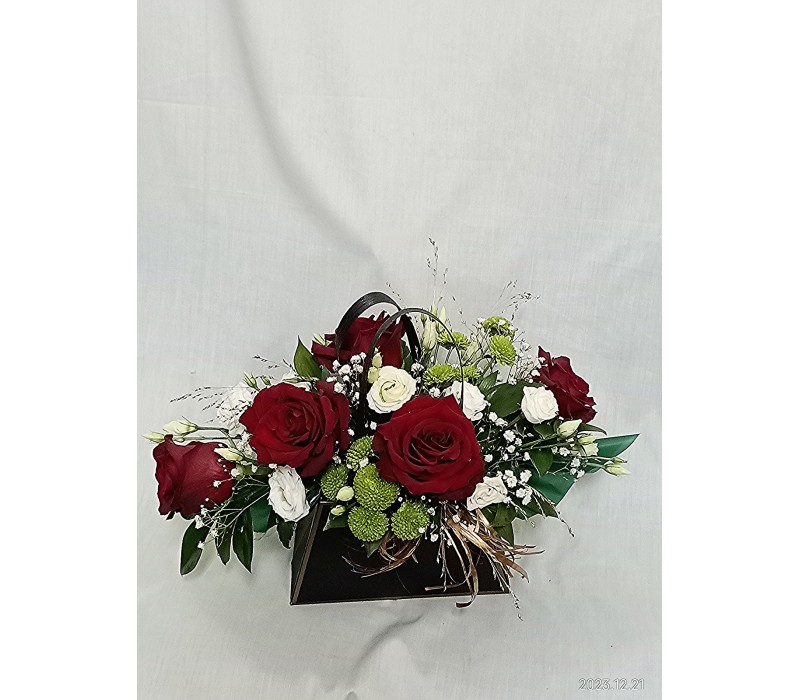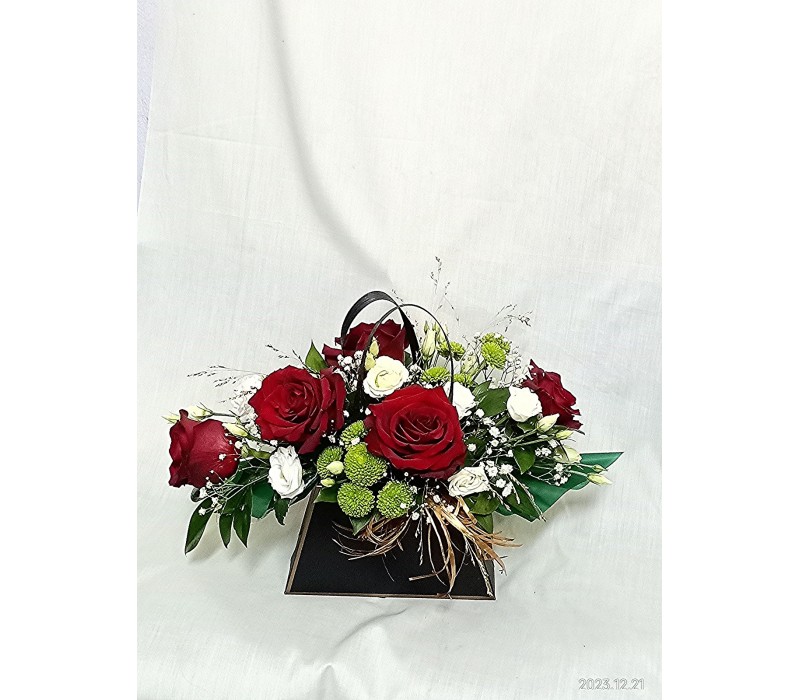 Пет червени рози аранжирани в стилна черна чантичка.