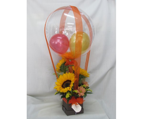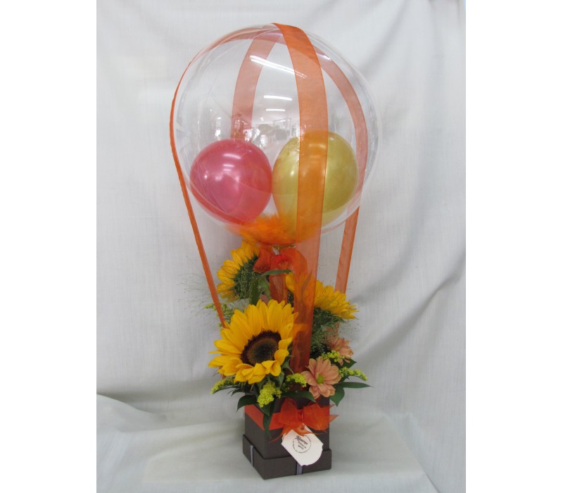 Кутия с цветя и празнични балони.